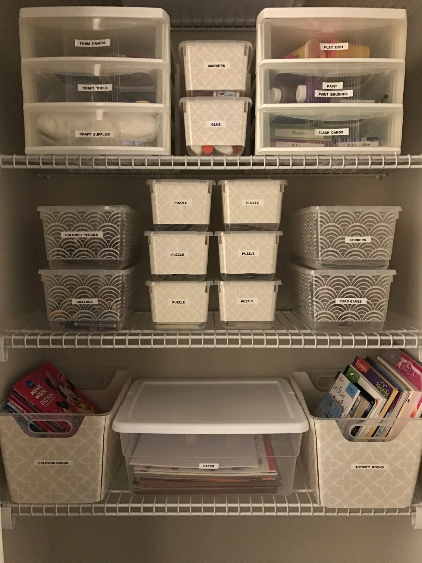 Solution: For this project, I converted an extra linen closet into the kids’ arts and crafts closet. The same solution could work in a cabinet or equivalent space. To keep investments of time and money low, use what you have and supplement with new. For this space, I used existing wire shelves and drawer containers – and purchased extra lidded and open containers. In terms of access… I reserved the upper shelves for those items that carry the highest risk for swift, semi-permanent damage (i.e. markers and paint)…the shelf at medium height for items that still need to be out of reach for the under-five crowd…and the bottom shelf for low-risk, frequently-used items such as coloring books and paper.